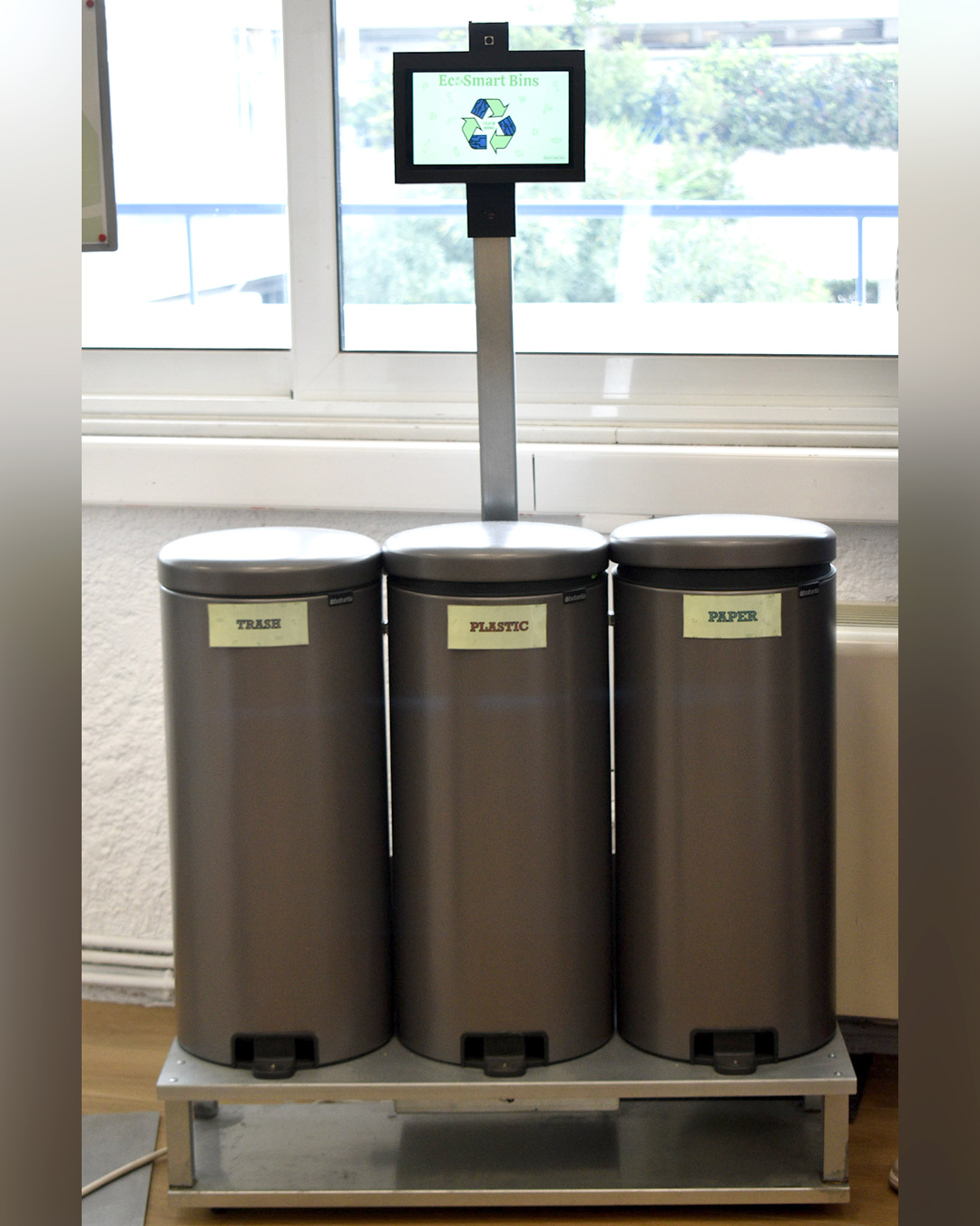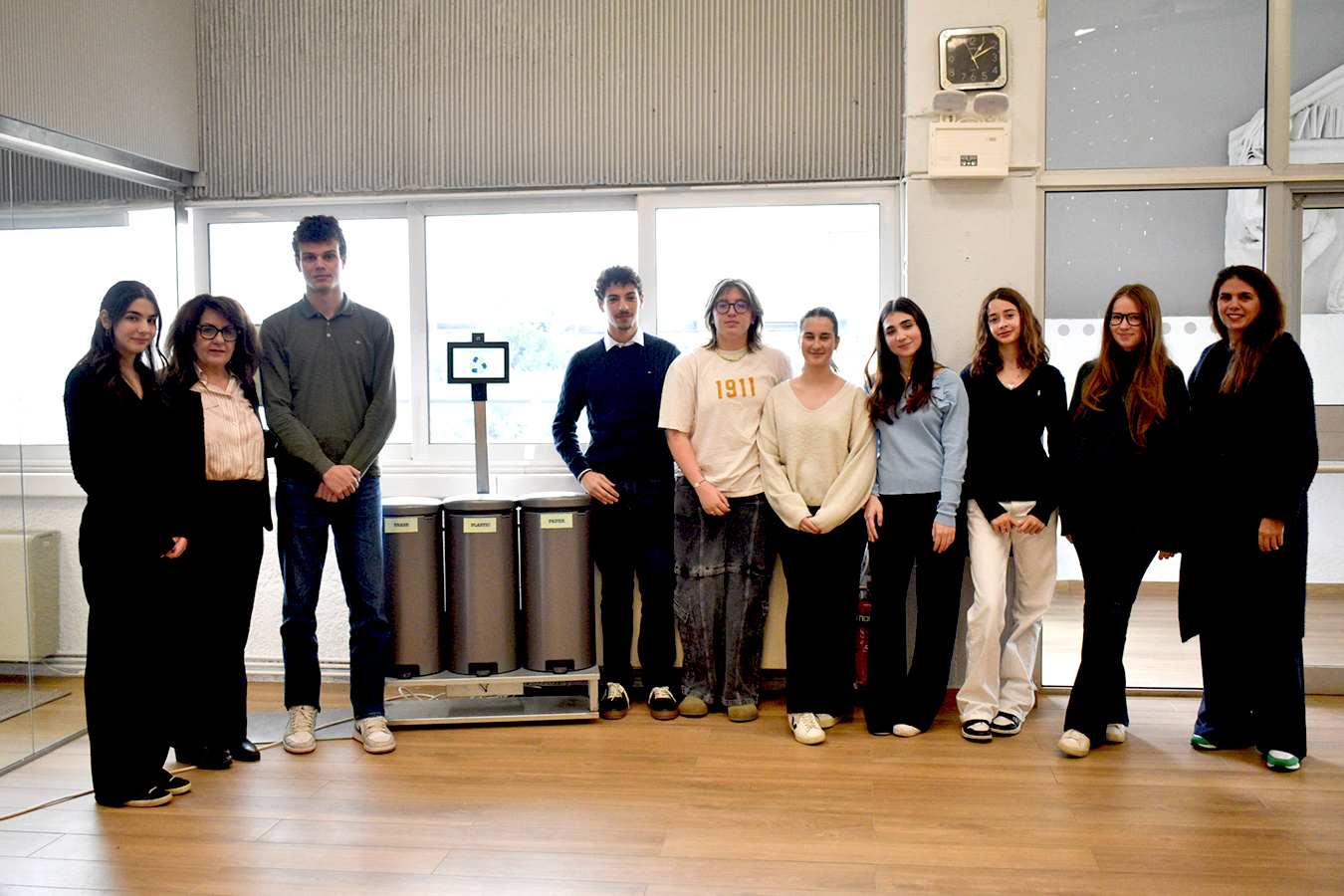 The journey began during her first year in the program, when Fotini and her original teammate, Qianhao Wang, explored how technology could motivate students to recycle correctly. Their early work, featured in the ACS Athens Institute’s article “ACS Athens Duo Seek to Make Recycling Easier and Engaging,” laid the conceptual foundation for a smart bin that could teach users how to sort waste properly.